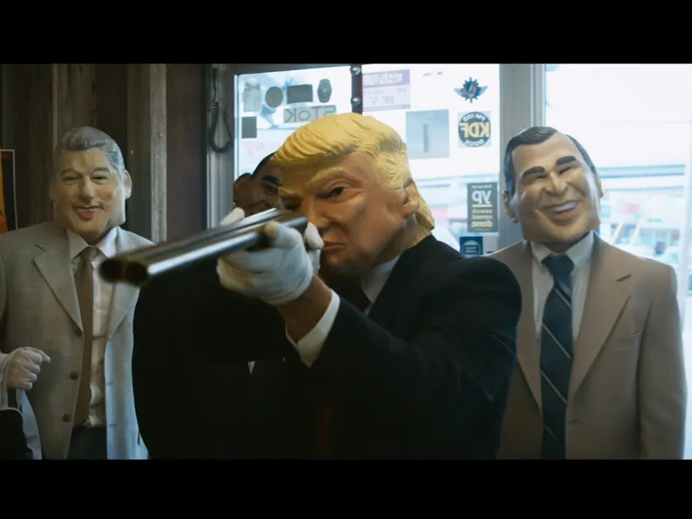 Presidents Trump, Obama, W. Bush and Clinton rob Brothers Pawn Shop before hitting the streets, where they are pursued by cops. Chaos ensues as the Presidents try to escape, including a masked cameo by a motorcycle-riding Hillary Clinton, who comes to Bill’s aid. Find out how Trump, Obama and Bush fare below.